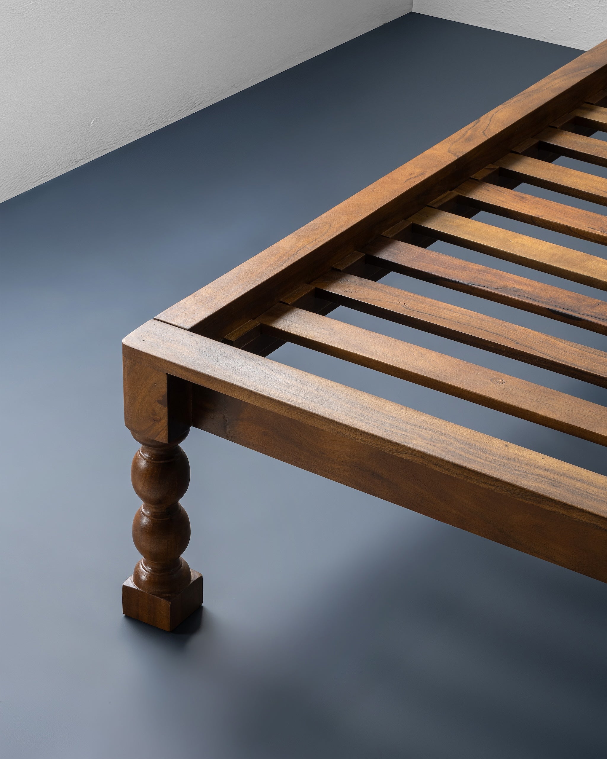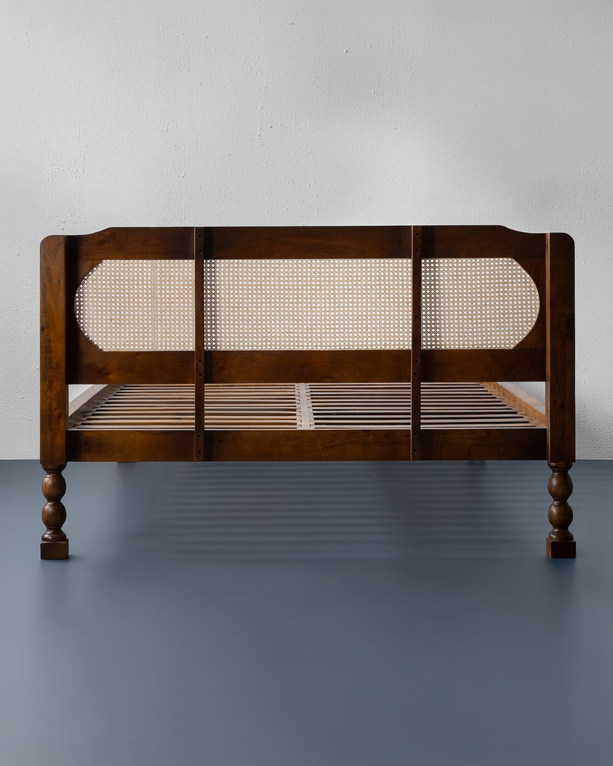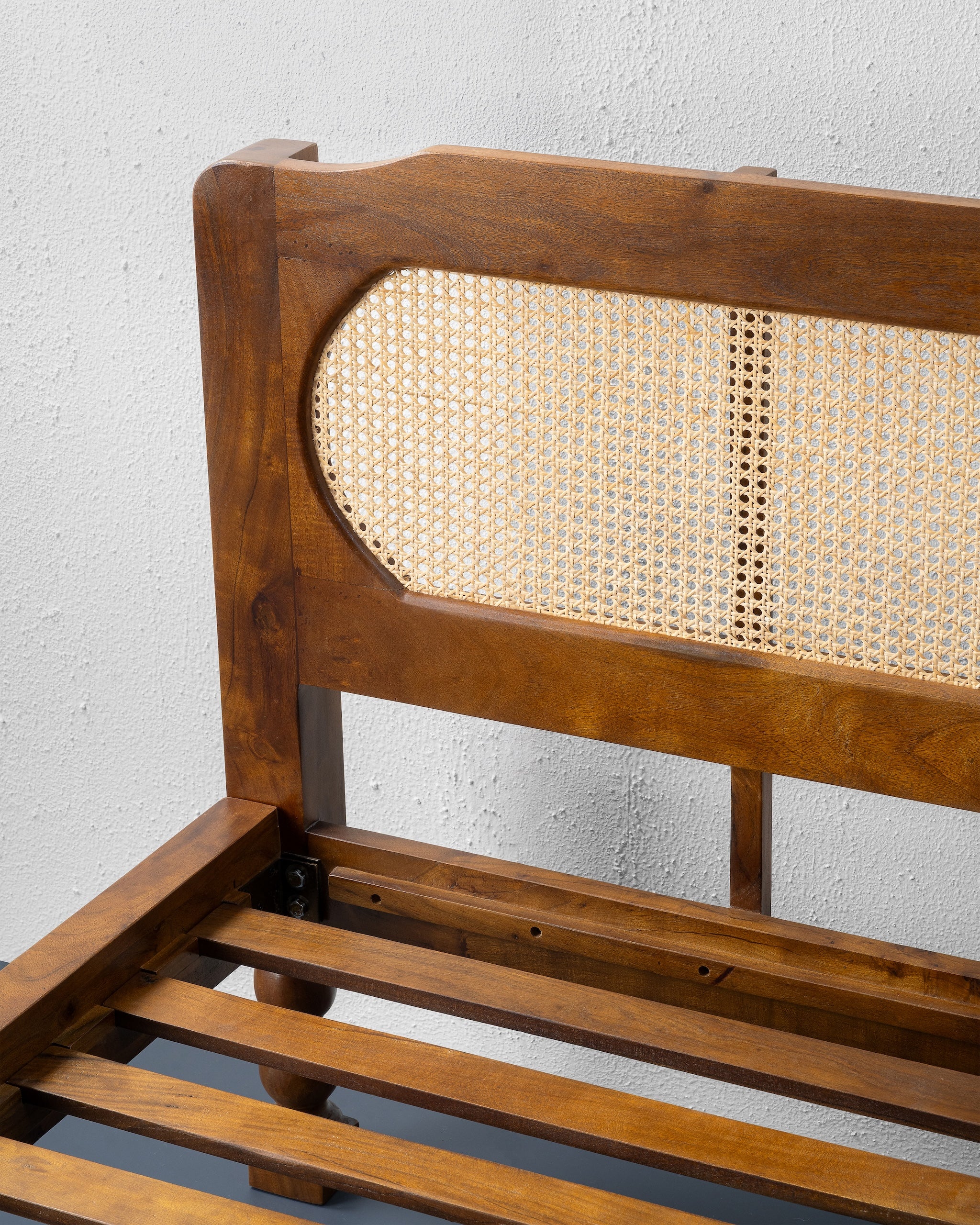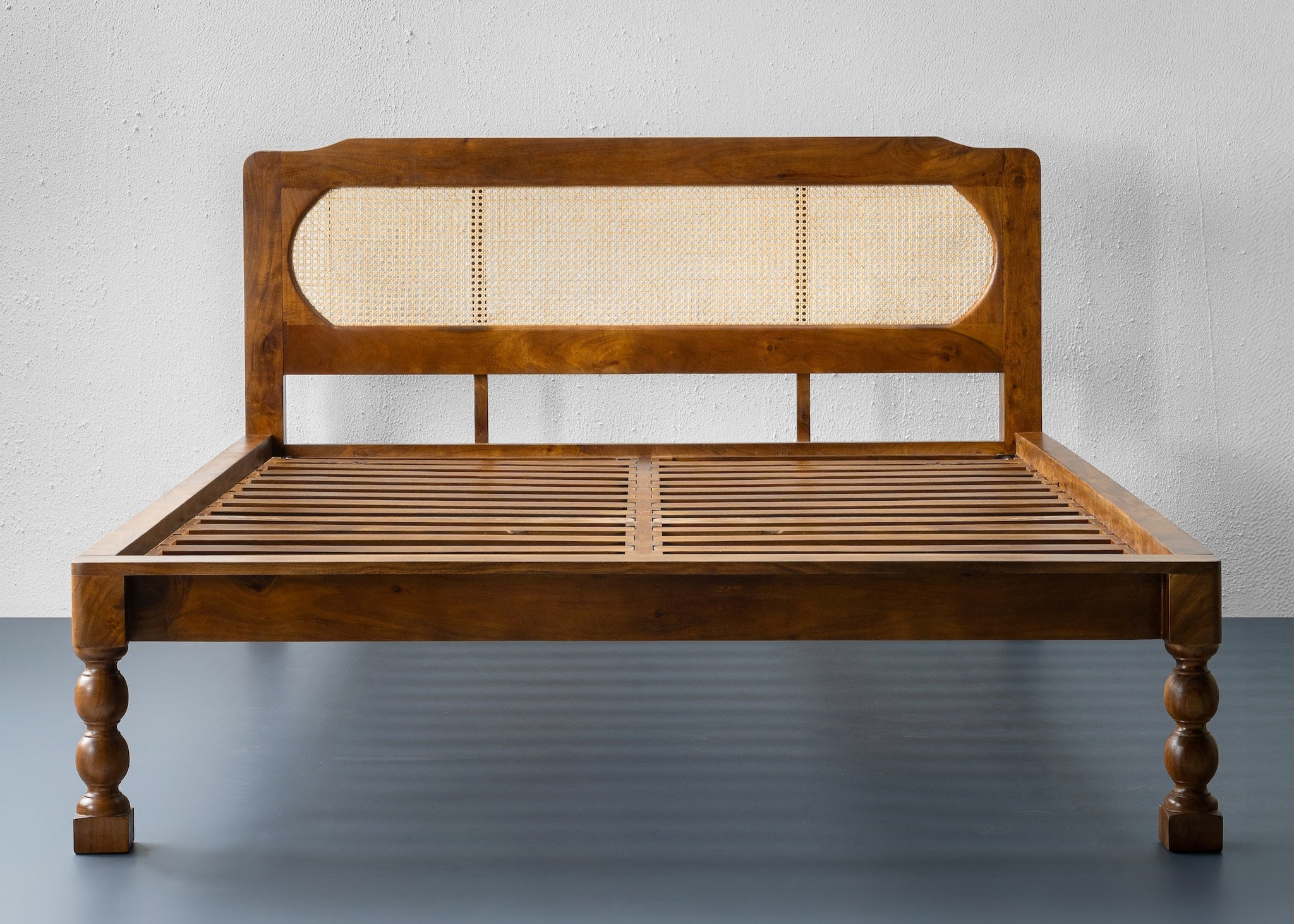 Crafted from solid acacia hardwood, the KONA Bed carries a quiet strength in its frame, lightened by a woven cane headboard. The curve of the headboard softens the outline, shaped from within to echo the arches of Indian doorways. Turned legs ground the form with steady presence, their rounded shapes resting on square bases. Together, the timber and rattan bring both warmth and air, a bed that feels sturdy yet open, made to last in either Queen or King size.