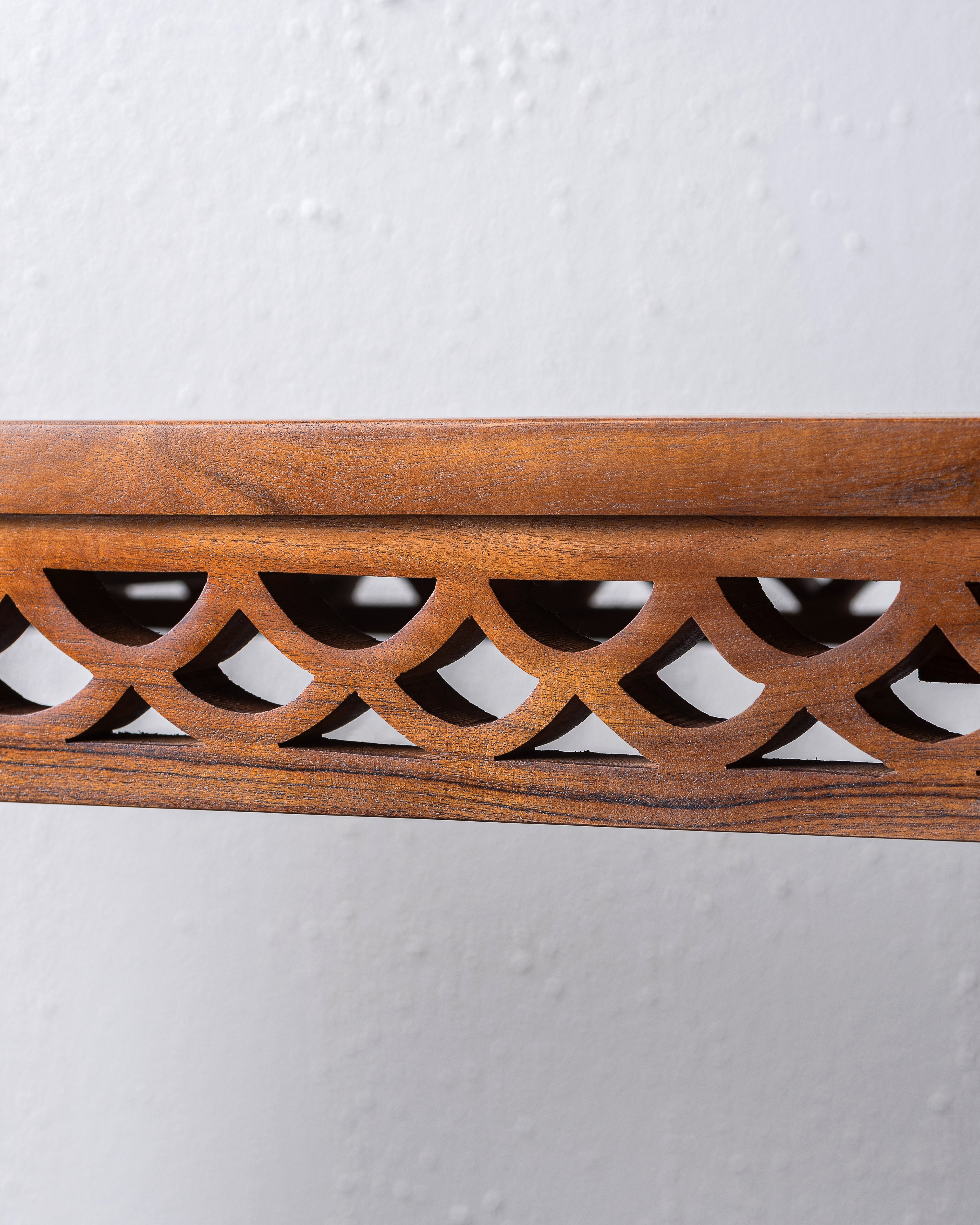 Crafted from sustainably grown acacia hardwood, the table is finished in a cooler brown tone with a low-sheen coat that keeps the grain visible. Its silhouette recalls the charpai, slimmed into a lighter, modern form with rounded edges and tapered legs. Along the apron, half-moon cut-outs soften the frame, echoing Mughal arches and jali screens, letting light pass through in shifting patterns as the day turns.